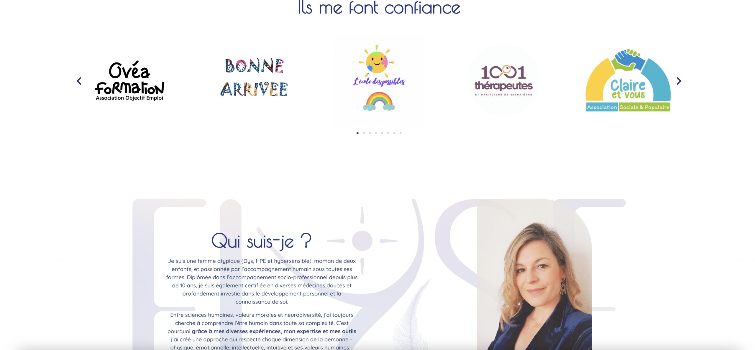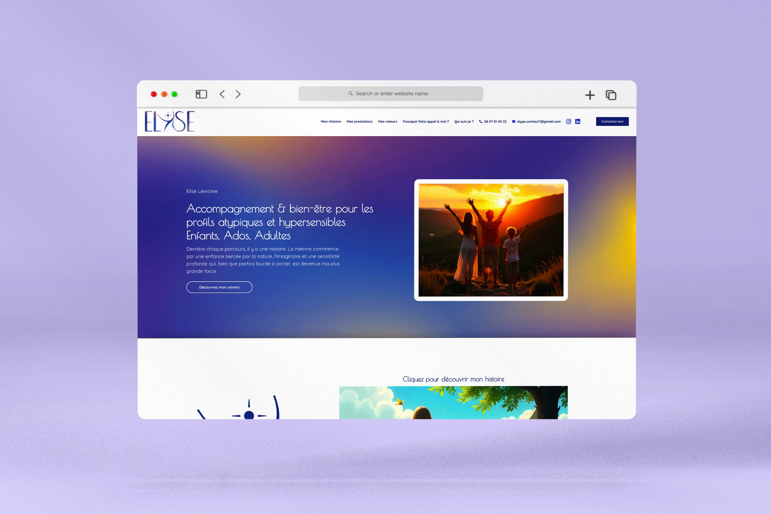 Conception d’un site clair et fluide : pages « Mon Histoire », « Prestations », « Valeurs », formulaire de contact, liens vers Instagram et LinkedIn. Site responsive pour navigation sereine sur mobile et ordinateur.