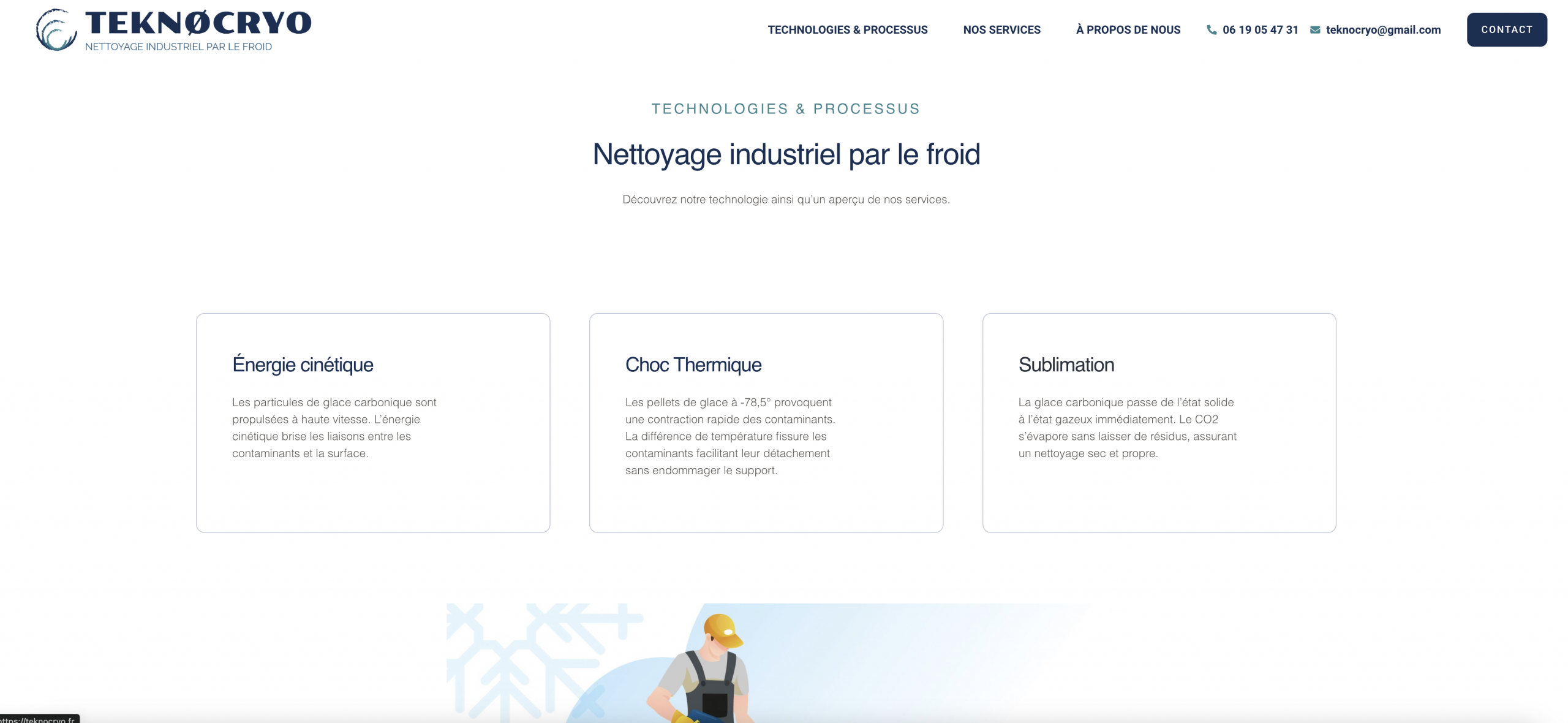 Développement complet du site Teknocryo.fr : navigation fluide, ergonomie optimisée, sections dédiées détaillant la méthode, les avantages (zéro résidu, respect de l’environnement), les domaines d’intervention et équipements . Intégration d’un formulaire de devis clair et accessible.