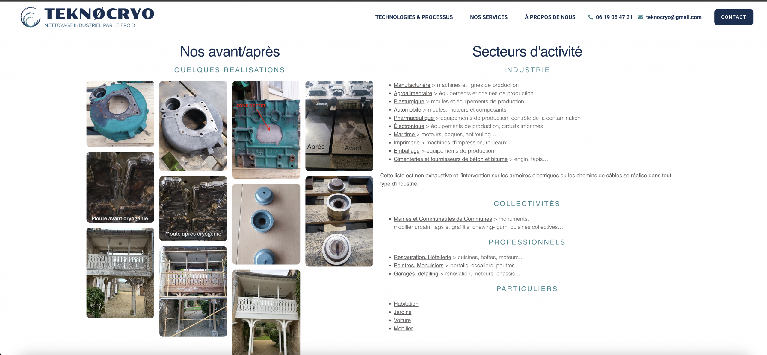 Création d’un design clair et moderne, en cohérence avec leur image de marque écologique et innovante. Utilisation de visuels explicatifs sur la cryogénie et le cryogommage, illustrations des domaines d’application (machines‑outils, hottes, bâtiments, etc.), et valorisation des retours clients.