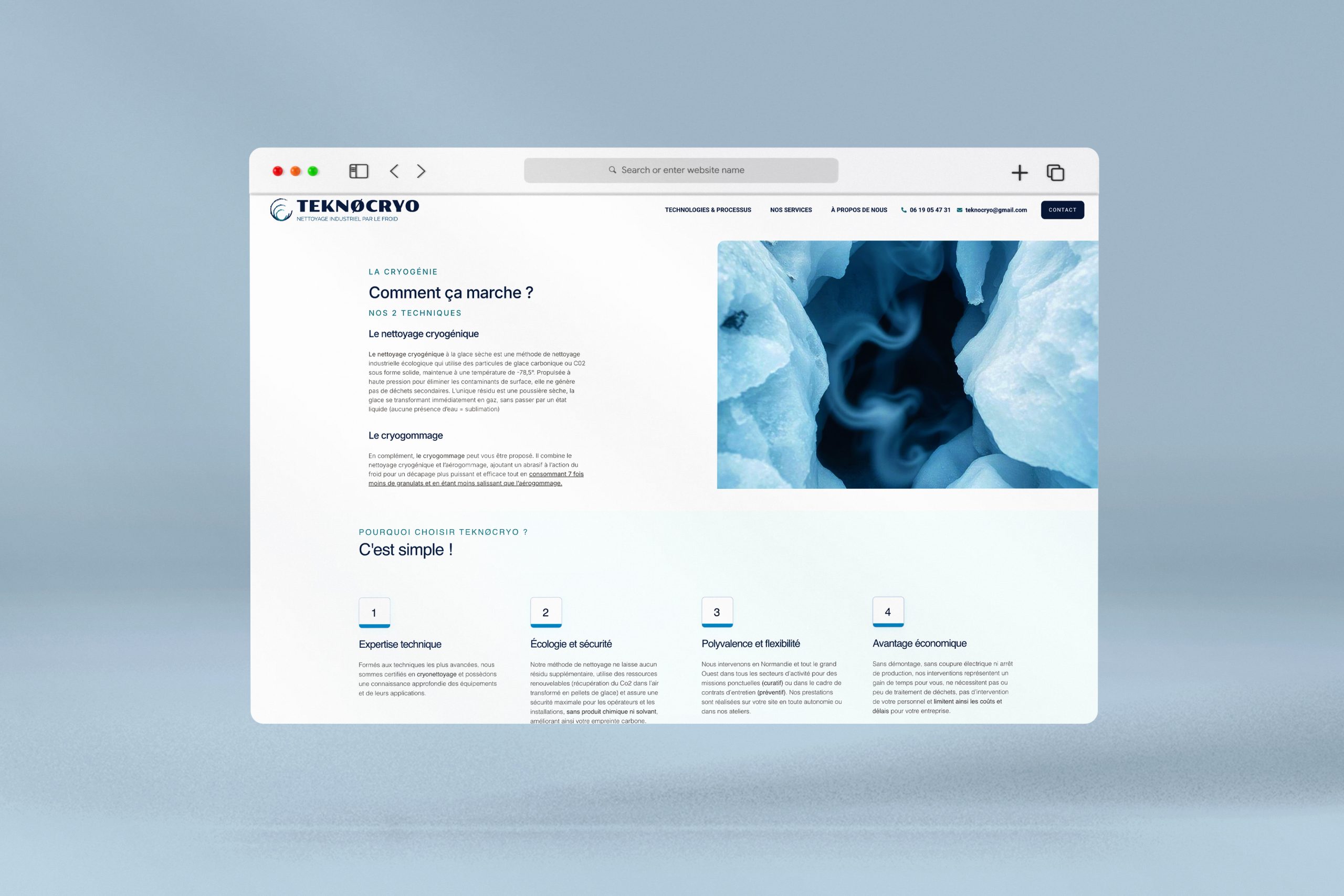 Teknocryo est une entreprise basée à Saint-Aubin-sur-Mer (Calvados), spécialisée dans le nettoyage et décapage cryogénique (glace sèche) et cryogommage, au service d’industries, collectivités, professionnels et particuliers sur tout le grand Ouest. L’objectif principal : concevoir un site web professionnel qui reflète leur expertise technique, leur engagement écologique et leur proximité régionale.